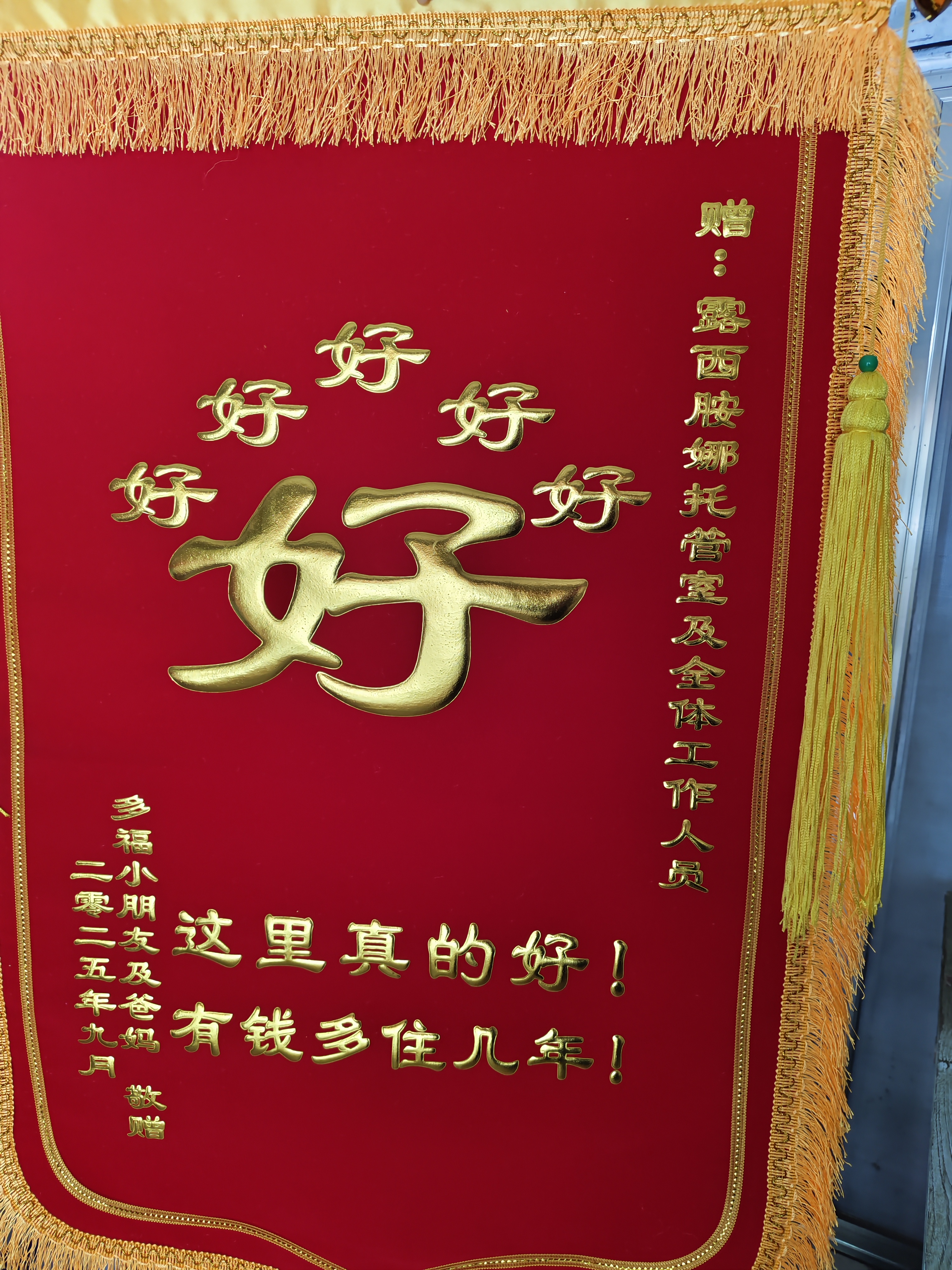 - 高档装饰配套标配金黄大龙须 + 金边包边,绒布底材垂感出众,整体装饰华丽大气,仪式感拉满,适配产康、服务等需要表达真挚感谢的正式场景。