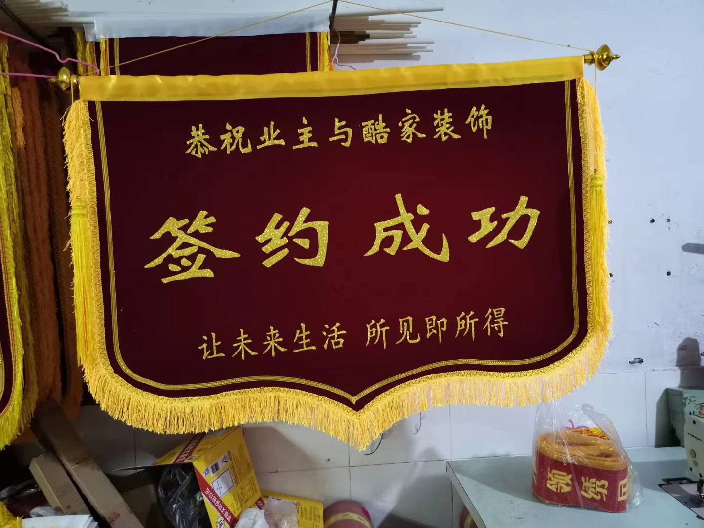 图中展示的是装修行业签约成功锦旗,以红绒布为底、搭配闪亮金字工艺 + 大龙须装饰,既承载签约成功的庆祝仪式感,又能整合企业信息实现宣传价值,是商业合作场景的实用礼仪用品: